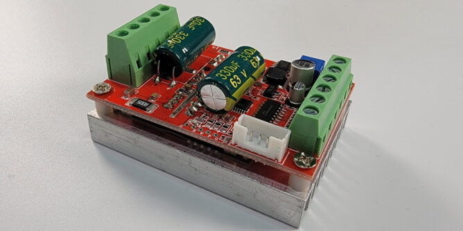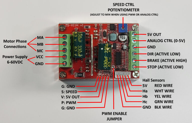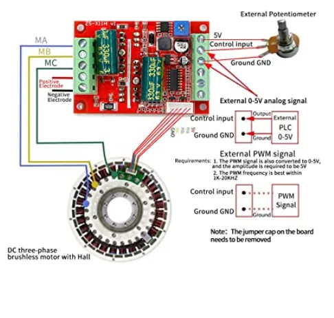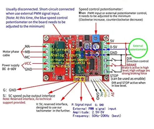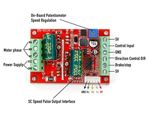 QS-909 JYQD is a low cost brushless motor driver with direction and speed control 12~36V, 500W (with heat sink), that comes in two variants: (1ª) with motor hall sensor input and (2ª) sensorless.